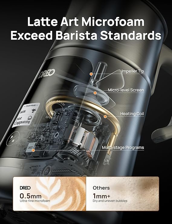 The Dreo BaristaMaker Automatic Milk Frother delivers creamy microfoam across all milk types using smart sensors and 30+ preset modes for optimal texture and temperature. With a 600 W motor, 27 oz capacity, and dishwasher-safe stainless steel jug, it’s designed for performance and convenience. Click to check full specifications, reviews, and best price.