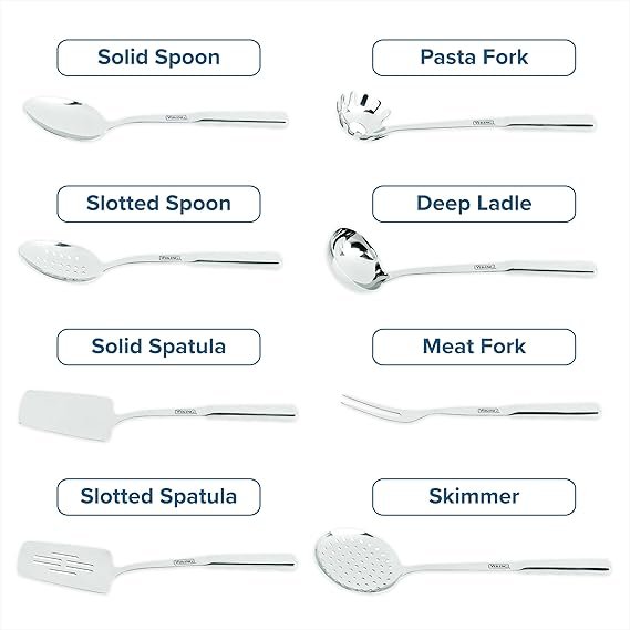 Upgrade your kitchen with the Viking 8-Piece Stainless Steel Utensil Set, crafted from durable, mirror-polished 304 (18/8) stainless steel. This comprehensive set includes spoons, spatulas, a pasta fork, ladle, meat fork, and skimmer — all featuring seamless construction and ergonomic hollow handles for comfort. Dishwasher safe and backed by a limited lifetime warranty, it’s ideal for both everyday cooking and elegant dining setups.